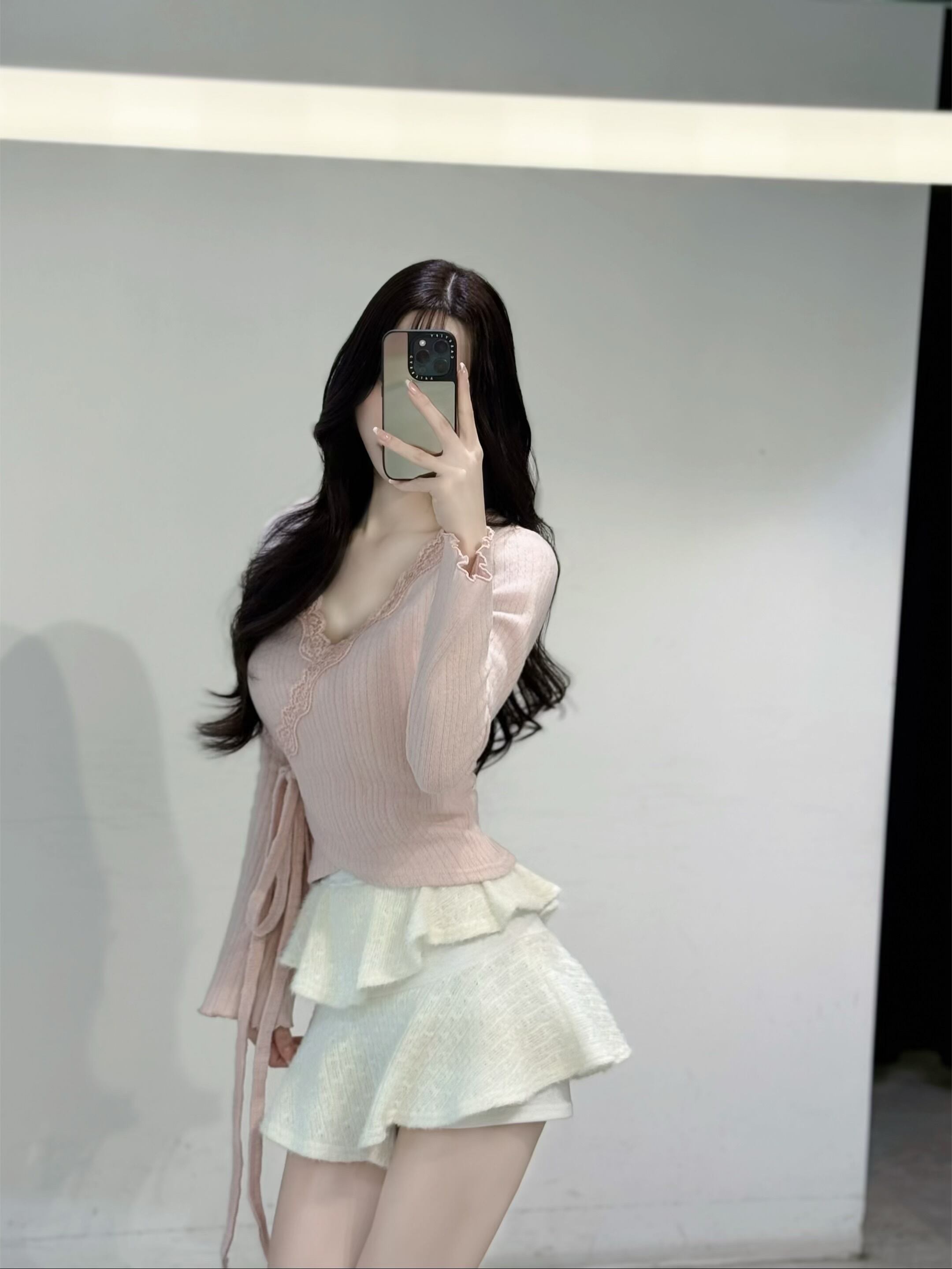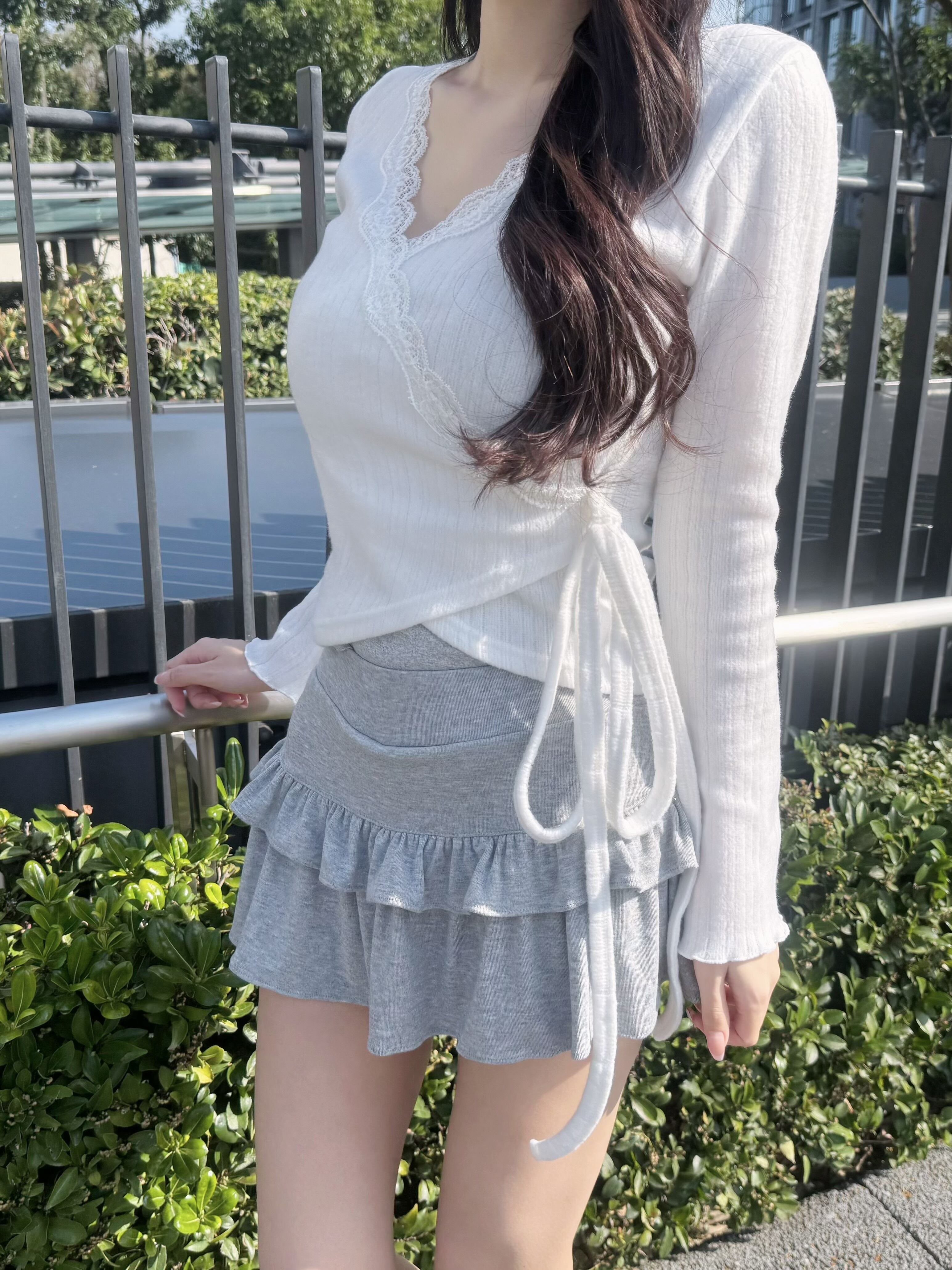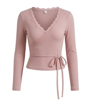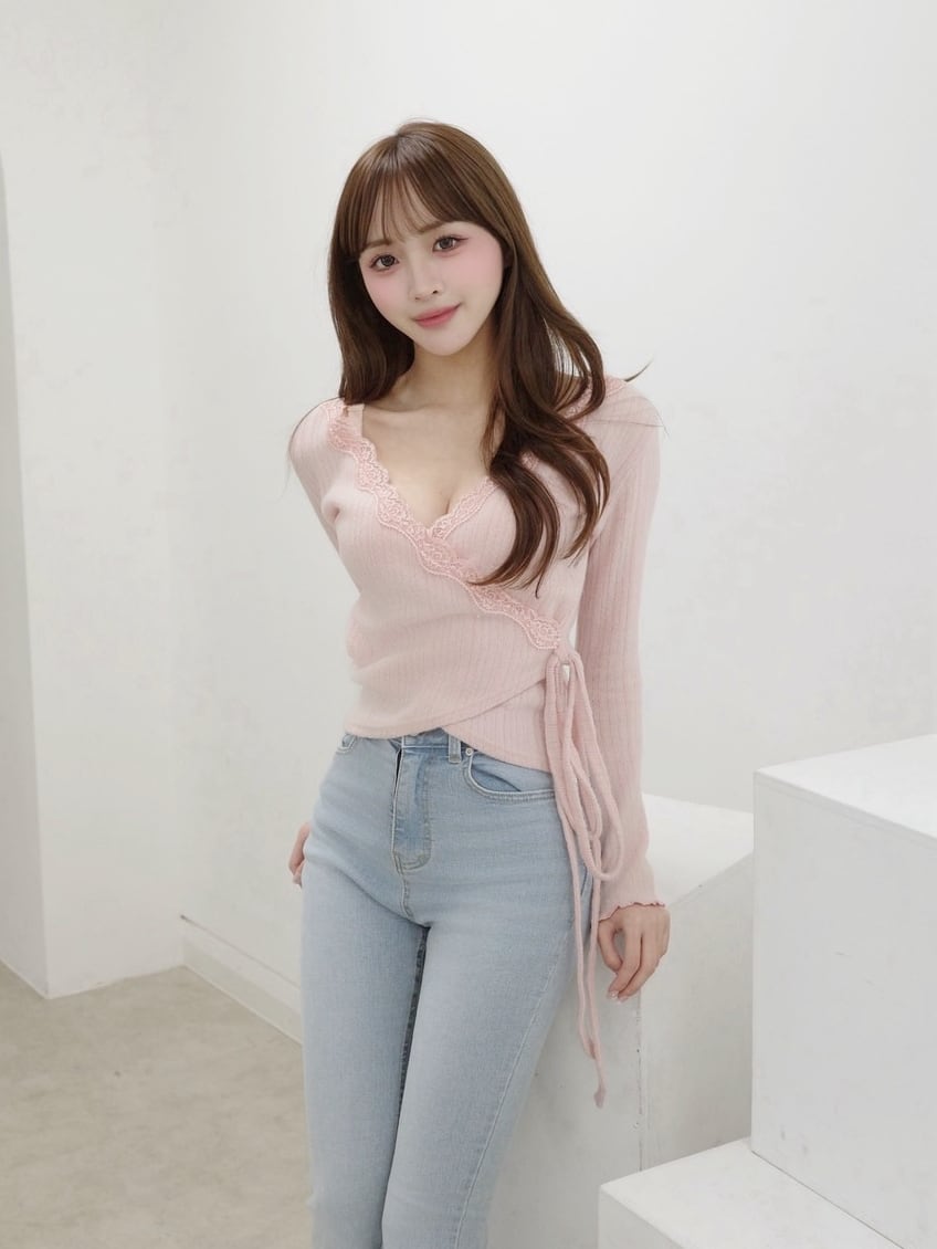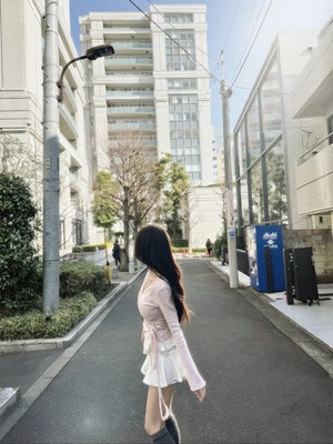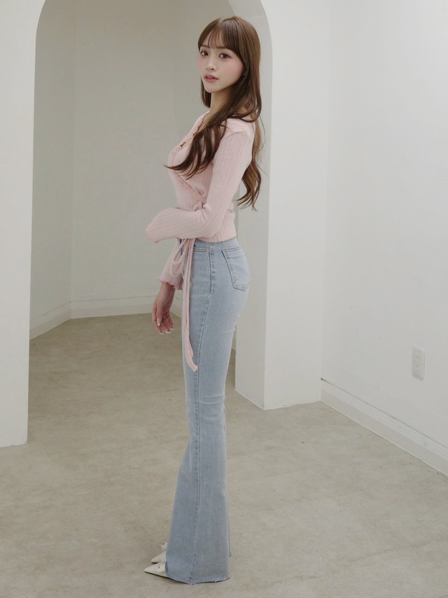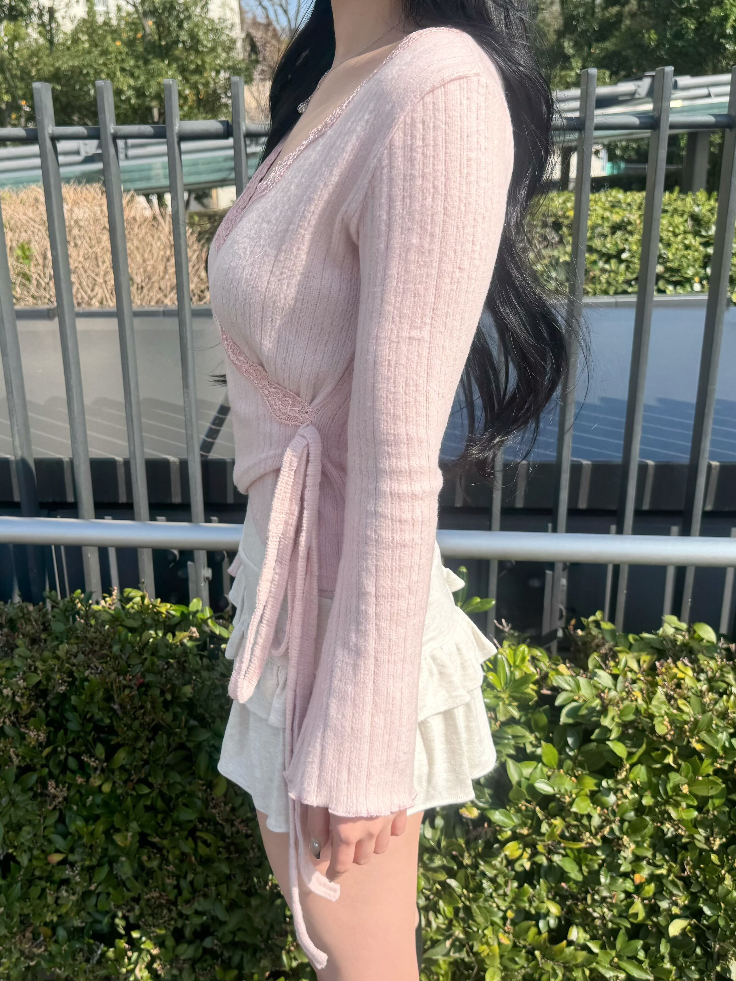 ウエスト部分はリボンで結ぶラップデザインになっており、